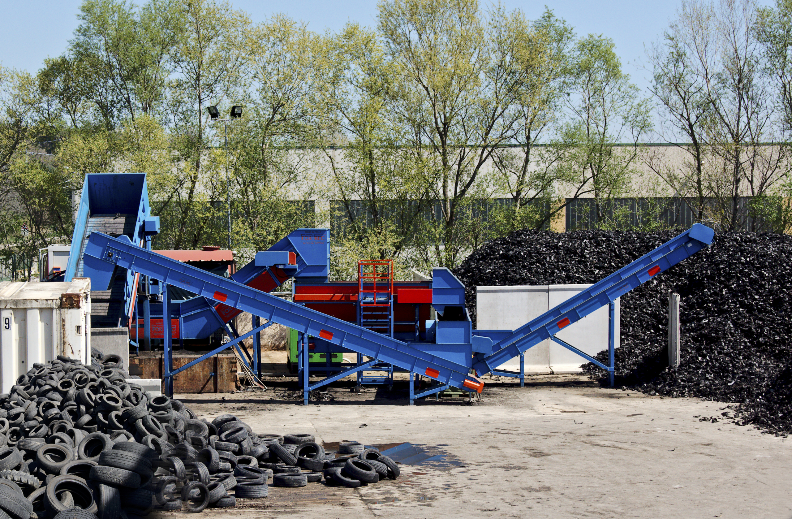 The granule cleaning system uses an advanced process that combines rotary screening systems, air and densimetric separators, pneumatic conveying, and suction. This system efficiently removes textile fiber and steel, resulting in clean granules between 0 and 4 mm in size.